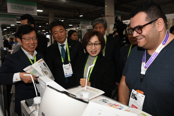 은 시장은 이날 먼저 18개 중소기업을 비롯해 성남지역 기업들의 전시부스를 둘러보고 관계자들을 격려했다. 피 한 방울로 건강을 체크할 수 있는 ‘원드롭’, CES 2019 기술혁신상을 수상한 공기청정기 ‘퓨리팟’, 네이버의 로봇팔 ‘앰비덱스’ 등을 살펴 본 은 시장은 참여 기업 관계자들과 국제 기술 동향에 대해 의견을 나눴다.