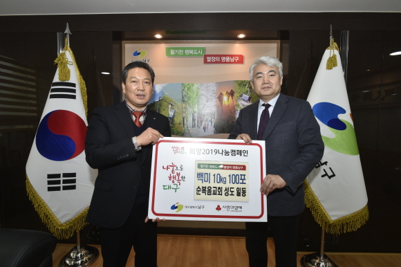[일요서울ㅣ대구 김을규 기자] 대구광역시 남구청(구청장 조재구)은 지난 15일, 대명10동 소재 순복음교회(담임목사 이건호)에서 이웃돕기 백미 10kg 100포(300만원 상당)를 기탁했다고 밝혔다.