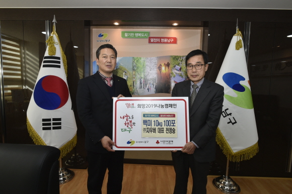 [일요서울ㅣ대구 김을규 기자] 대구광역시 남구청(구청장 조재구)은 지난 24일, ㈜자우버 전정숭 대표이사가 이웃돕기 백미 10kg 100포(300만원 상당)를 기탁했다고 밝혔다.