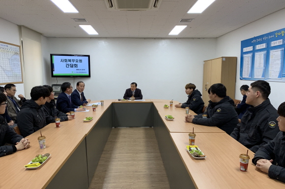 이어진 사회복무요원과의 간담회에서는 장애인활동 지원 업무가 힘들겠지만 매우 가치있는 일이므로, 사회 한 분야에서 희망의 등불 역할을 수행한다는 생각으로 병역이행에 대한 자부심과 긍지를 갖고 성실히 복무할 것을 당부했다.