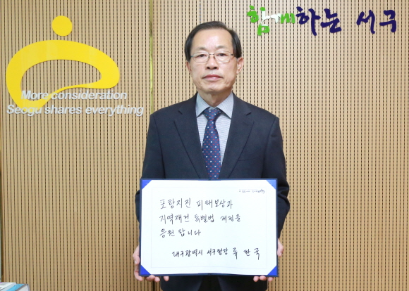 류한국 구청장은 “지진 피해로 고통 받고 있는 포항시민들에게 위로의 뜻을 전하며, 빠른 시일 내 포항지역 재건과 경제살리기를 위해 서구민들께서도 국민청원 캠페인에 적극 동참해 줄 것을 바란다”고 말했다.