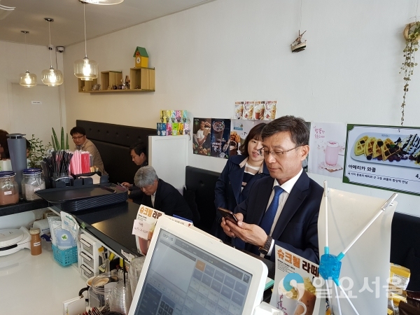 [일요서울|김포 강동기 기자] 12일 정하영 김포시장이 지역화폐 ‘김포페이’ 1호 가맹점 사우동 ‘플로리안 카페’에서 사용법을 시연했다.