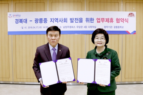 [일요서울|수도권 강의석 기자] 경복대학교는 지난 17일 남양주캠퍼스에서 광릉중학교와 학생들에게 다양한 예술문화체험 기회부여와 지역사회의 지속가능한 ‘문화예술이음학교’의 발전을 위해 업무제휴 협약을 체결했다.