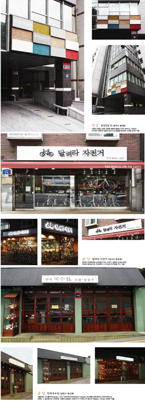 건물의 외관을 고려한 색채와 통일된 규격으로 기능성이 우수하여 연립간판의 일반적인 표시 방법을 탈피하는 대안을 제시한 작품으로 평가받은 ‘대상’의 효정건업을 비롯해서 금상2점, 은상3점, 동상5점, 장려상 20점의 좋은 간판 총 31점은 오는 9월 17일부터 10월 7일까지 개최되는 서울디자인한마당 행사장(잠실주경기장)에서 시민들에게 전시된다.