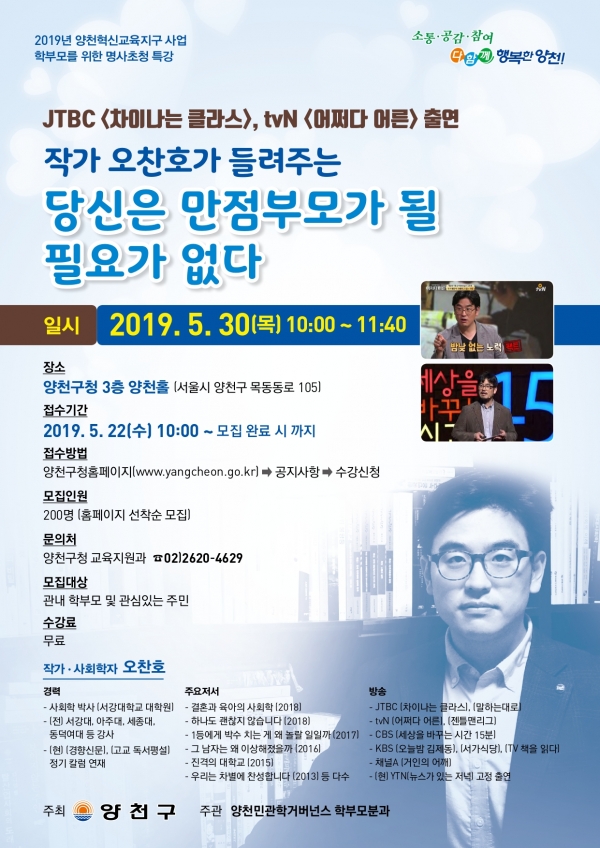 [일요서울ㅣ이완기 기자] 양천구(구청장 김수영)는 오는 30일(목) 오전 10시 양천구청 3층 양천홀에서 JTBC <차이나는 클라스>, tvN <어쩌다 어른> 등에 출연한 작가 오찬호를 초청해 학부모를 위한 명사초청 특강을 개최한다.