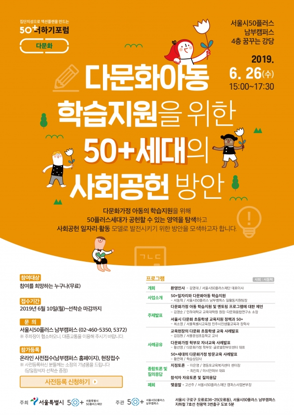 이번 포럼에서는 학령기 다문화가정 자녀의 안정적인 성장을 돕는 50+세대의 사회공헌 활동 영역과 일자리 모델 발굴에 대한 논의가 이뤄진다.