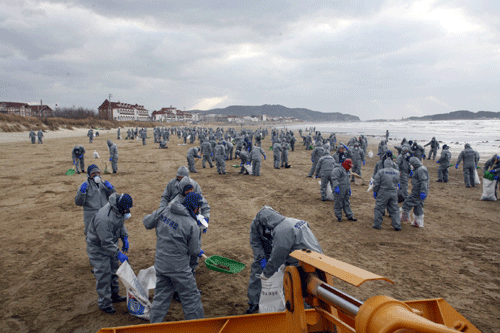 서해안 기름 유출 피해 복구에 나선 현대중공업 노사(勞使).