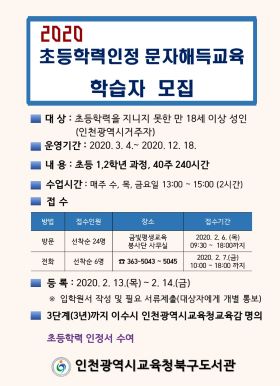 [일요서울 |인천 조동옥 기자] 인천광역시교육청북구도서관(관장 나영희)이 2020년 초등학력인정 문자해득교육 프로그램 1단계를 운영한다고 밝혔다.