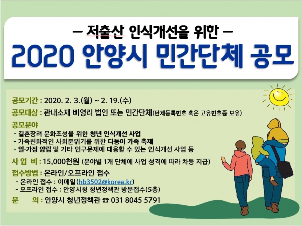 관 위주로 시행되었던 저 출산 인식개선사업을 민간 영역으로 확대해 시민들이 실질적으로 체감할 수 있는 사업을 발굴하겠다는 취지다.