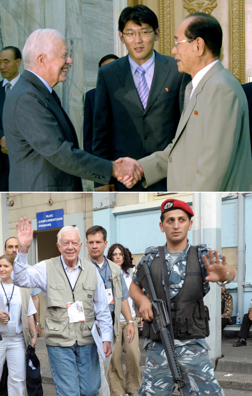 지난 8월 25일 북한을 방문한 지미 카터 전 미국 대통령(왼쪽)이 평양 만수당의사당에서 김영남 최고인민회의 의장과 악수하고 있다. 카터 전 미 대통령은 북한에 억류 중인 미국인 아이잘론 말리 곰즈(30)의 석방을 위해 방북했다. (위)지난해 중동 분쟁과 관련해 레바논을 방문한 지미 카터 전 미국 대통령이 베이루트 북부 지역에 마련된 투표소를 떠나고 있다. 카터 전 대통령은 레바논 총선 국제참관단을 이끌고 입국했다.