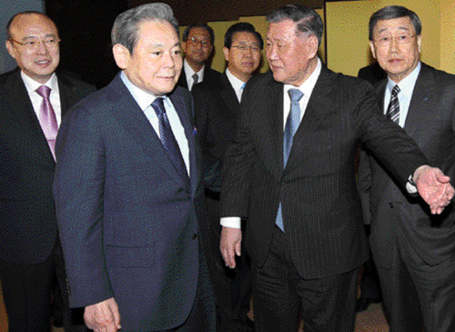 역대 최다인 17명의 회장이 모인 전국경제인연합회 회장단회의가 지난 3월 10일 하얏트호텔에서 열렸다. 호스트 역할을 한 현대차 정몽구 회장이 재계 맏형인 이건희 회장을 배려하듯 길을 터주고 있다. 그동안 전경련 회의는 주로 롯데호텔에서 열렸는데 이날은 정회장의 지시로 하얏트 호텔로 변경됐다는 후문. 이건희 회장 자택과는 불과 5분거리 여서 이회장에 대한 정회장의 배려가 아니냐는 평도 나오고 있다.