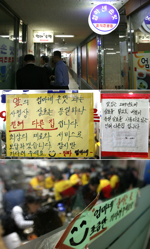 여의도 증권가의 한 건물 지하식당가. 점심시간이면 주변 직장인들로 북새통을 이루는 곳이다. 맛집으로 소문난 한식집의 이름은 ‘엄마네 손맛’. 그런데 복도를 사이에 두고 같은 이름의 식당이 나란히 영업을 하고 있다. 순간 같은 식당이 장사가 잘돼 확장했다고 생각하기 십상이지만 둘은 엄연한 다른 집이다. 문앞에 적어 놓은 주인장의 메모도 두 식당이 ‘전혀 다른 집’임을 강조하고 있다. 같은 이름을 사용하는 전혀 다른 집. 두 식당 사이의 미묘한 신경전이 직접 보지 않아도 치열하게 그려진다. 엄연한 사실은 둘 중 한집만이 맛집으로 소문나 문전성시를 이루고 있다는 것. 덕분에 줄을 기다리기 힘든 사람들이나 같은 식당으로 착각한 사람들이 건너편으로 발길을 돌려 ‘같은 이름 다른 집’도 재미가 쏠쏠하다. 한 지붕 두 가족의 공생 아닌 공생관계가 언제까지 지속될지 자못 궁금하다.