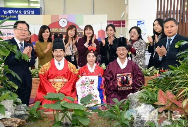 ▲혼인과 출산에 대한 긍정적 환경조성과 신혼부부의 새 출발을 기념하고 행복한 추억을 선사하기 위해 의정부시는 전통혼례복을 입고‘시장과 함께하는 인증샷’이벤트를 매월 1회 이상 실시하고 있다.