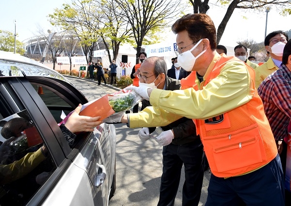 [일요서울ㅣ경북 이성열 기자] 이철우 경북도지사가 4일(토) 대구월드컵 경기장에서 열린 지역 농산물 판매 드라이브 스루 마켓에서 미나리 등 지역 농산물을 판매하고 관계자들을 격려했다.