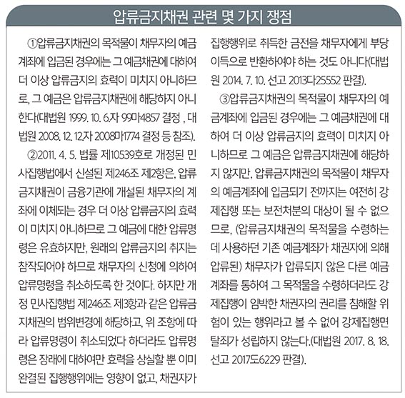 그렇다면 근로자퇴직급여보장법상의 양도금지 규정과 민사집행법의 압류금지 규정의 관계가 어떻게 되는지 문제가 생긴다. 대법원은 이에 대하여 근로자퇴직급여보장법상의 양도금지 규정이 우선하여 적용되기 때문에 퇴직연금채권은 법률에 의하여 양도가 금지된 채권으로서 압류할 수 없다고 판결하였다(대법원 2014. 1. 23. 선고 2013다71180 판결). 확정급여형·확정기여형 퇴직연금 제도나 개인형 퇴직연금제도의 퇴직연금 채권에 대해서도 마찬가지로 적용될 수 있다. 그러나 퇴직금 제도에 대해서는 근로자퇴직급여보장법 제7조가 적용되지 아니하므로, 민사집행법 에 따라 2분의 1에 해당하는 금액은 압류할 수 있다(대구지방법원 2014. 9. 26. 선고 2014나3113 판결).