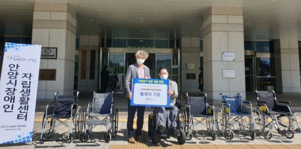 1일(10:00) 안양시청사 중앙현관 앞, 안양시장애인자립생활지원센터의 휠체어 5대 기증식이 진행됐다. 장애인자립생활지원센터가 수리해 세척과 소득을 마친 휠체어다.