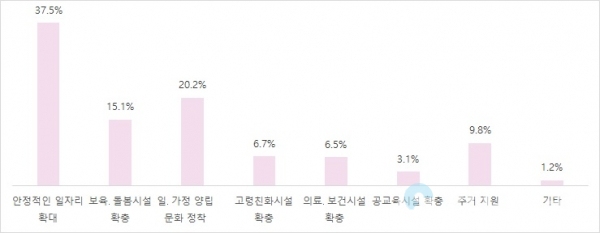 20세 이상 김포시민 590명이 온‧오프라인으로 응답한 조사 결과, 저출산‧고령사회 해결을 위해 필요한 정책으로 시민들은 ‘안정적 일자리 확대’에 37.5%로 가장 많은 의견을 나타냈다.