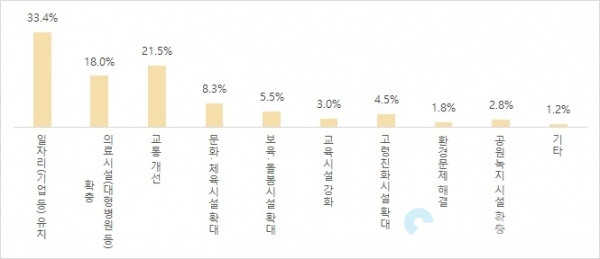 또한 살기 좋은 김포를 위해 필요한 정책에 대한 응답도 일자리(기업 등) 유치에 대한 비율이 33.4%로 가장 높았다.