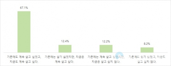 코로나19로 김포시 정주의식에 변화가 생겼는지에 대한 질문에는 67.1%가 ‘기존에도 계속 살고 싶었고, 지금도 계속 살고 싶다’고 응답했으며, ‘기존에는 살기 싫었지만, 지금은 계속 살고 싶다’가 12.4%로 뒤를 이어 79.5%가 김포시에 계속 살고 싶다는 의견을 나타냈다.