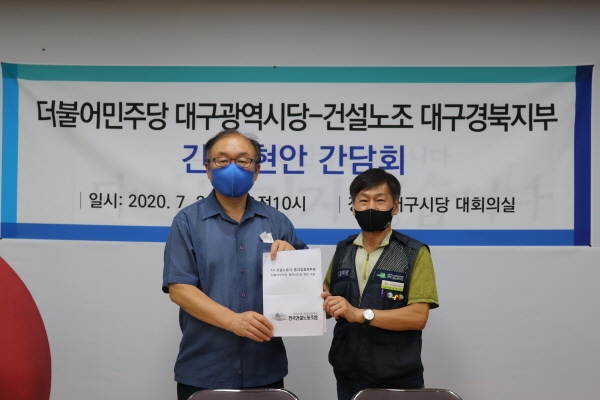 [일요서울 l 대구 김을규 기자] 건설노동자 총파업투쟁을 앞두고 더불어민주당 대구광역시당(위원장 남칠우)은 건설노조 대구경북지부와 건설 노동자 현안과 관련 긴급간담회를 가졌다.