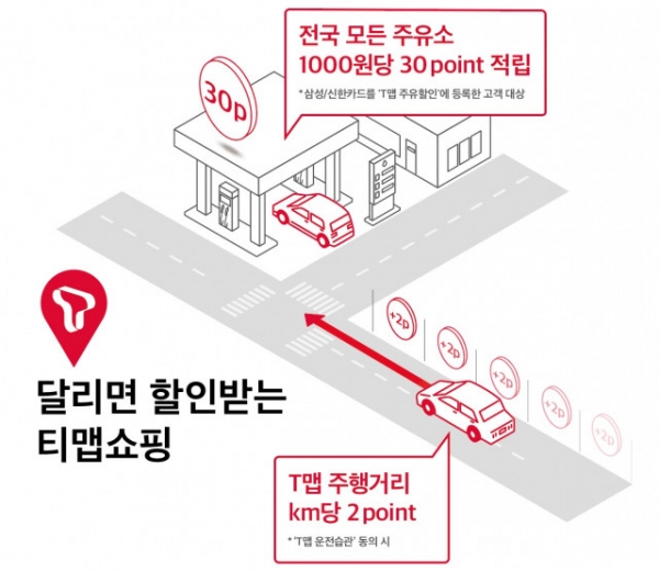 ‘T맵 쇼핑’ 이용자는 T맵 이용을 통해 상품 할인을 받을 수 있는 ‘쇼핑 포인트’를 적립할 수 있다. ‘쇼핑 포인트’는 T맵 주행거리 1km당 2P씩 그리고 전국 모든 주유소에서 주유 결제금액 1000원당 30P씩 적립된다.