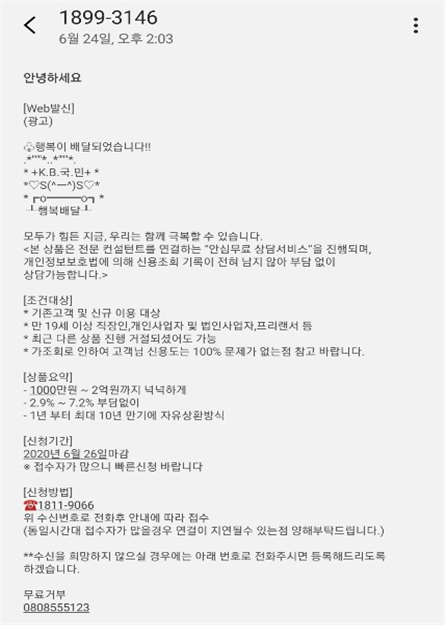 [일요서울 | 신유진 기자] #1 충북에 거주하고 있는 A(30대, 남) 씨는 캐피탈 대출금리가 높다고 생각하고 있던 차에 대출 광고문자를 보고는 낮은 금리로 갈아타고, 필요자금도 마련할 겸 문자상의 전화번호로 연락했다. 사기범은 A 씨에게 K 은행을 사칭한 신용대출 상품 이미지와 함께 보낸 IP주소를 보내 성명, 주민등록증을 입력하게 했다. 대출금액은 2000만 원이 가능하다면서 주민등록증 앞면 사진, 대출금 입금 통장사본을 요구했다. 다음날 사기범은 캐피탈 400만 원을 갚아야 대출이 가능하다면서 상환을 요구해 이를 수상히 여긴 피해자가 순간 사기가 아닌지 의심이 들어 확인 차 금융소비자연맹으로 연락해 사기 피해를 당하지는 않았다.