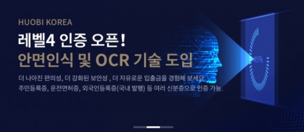 글로벌 가상자산 거래소 후오비 코리아(Huobi Korea)는 안면인식과 광학식 문자 인식(Optical character recognition, OCR)을 통한 본인인증(레벨 4) 시스템을 도입한다고 29일 밝혔다.