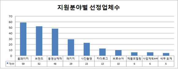 ‘산업디자인’은 3D렌더링 및 모델링 등의 제품디자인을 지원하고, ‘영상디자인’은 사진촬영 및 홍보영상물 촬영ㆍ제작을 지원하며, ‘지식서비스’는 세무 및 회계 서비스를 지원한다.