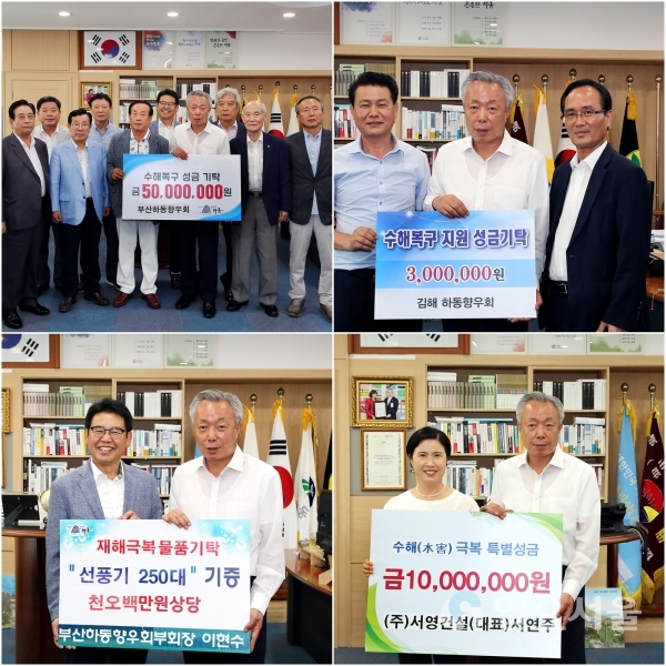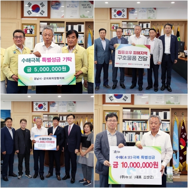 진주경찰서하동경찰향우회(회장 백재익)가 수해 기부금 100만 원, 상사모(회장 박용선)가 100만 원, 김해 소재 ㈜서영건설(대표 서연주)이 1000만 원, 중소기업벤처기업진흥공단(이사장 김학도)이 1000만 원을 각각 기탁했다.