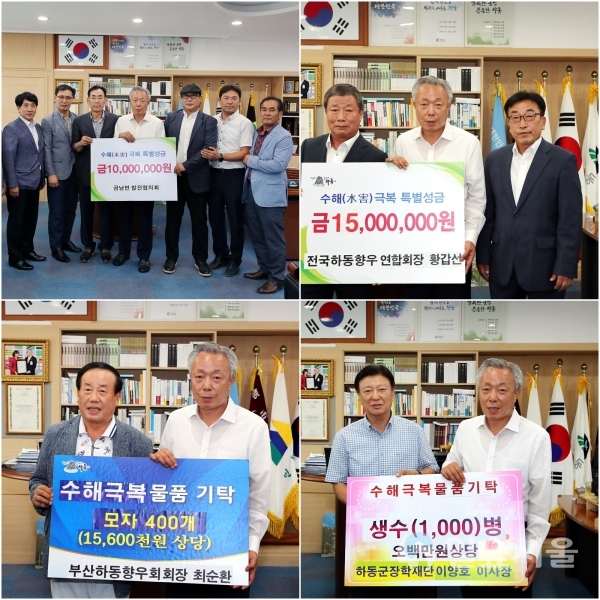 또한 이날 부산하동향우회(회장 최순환)가 고향의 수재민을 돕고자 수해 기부금 5000만 원을, 황갑선 전국하동향우연합회장이 1000만 원을, 재진하동향우회(회장 김택세)가 785만 원을, 김해하동향우회(회장 정순룡)가 300만 원을 각각 내놨다.
