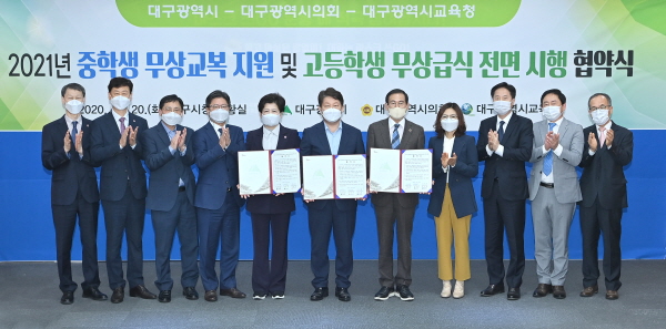 대구시와 시의회, 시교육청은 학생들의 교육복지 증진과 학부모들의 교육비 부담 경감을 위해 2021년 중학교 신입생에게 무상교복을 지원하고 고등학생 전면 무상급식을 조기 시행하기로 했다.