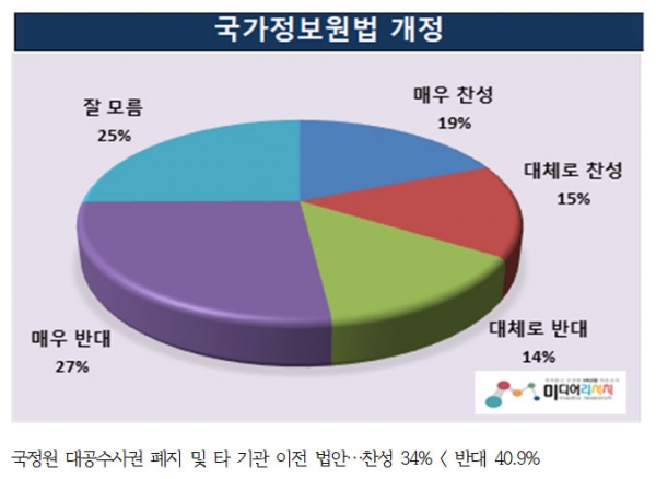여론조사 전문기관인 미디어리서치가 1127일 발표한국정원이 갖고 있는 대공수사권을 폐지해 다른 기관으로 이관한다는 국정원법 개정안과 관련한 질문에 찬성 34.0% 대 부정 40.9%로 부정이 긍정보다 약간 높게 조사됐다. 잘 모르겠다는 25.1%.