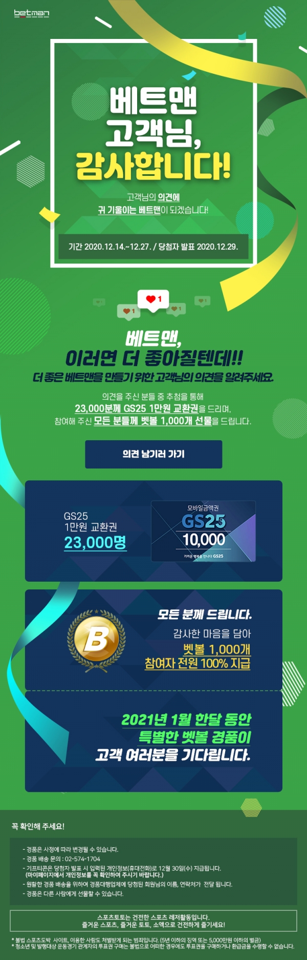 참여한 모든 고객에게는 베트맨 사이트 내의 다양한 경품 응모가 가능한 벳볼 1,000개를 지급하며, 추첨을 통해 2만3000명에게는 1만원 상당의 GS25 모바일 기프티콘을 지급한다.