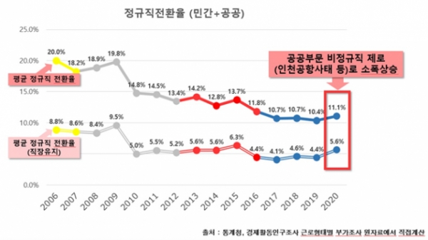 하지만 정작, 국가 전체의 비정규직 현황은 역대 최저수준으로 악화된 것으로 나타났다. 연도별 정규직 전환율을 살펴보면 2006년 20%에 달하던 정규직 전환율은 문재인 정부 들어서 2017~2018년 10.7%, 2019년 10.4%, 2020년 11.1%를 기록했다. 같은 직장 내 정규직 전환율 역시 2017년 4.1%, 2018년 4.6%, 2019년 4.4%, 2020년 5.6%에 그쳤다.
