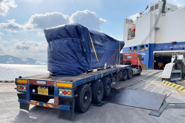 현대글로비스 자동차 운반선에 열교환기가 선적되고 있다 [현대글로비스 제공]