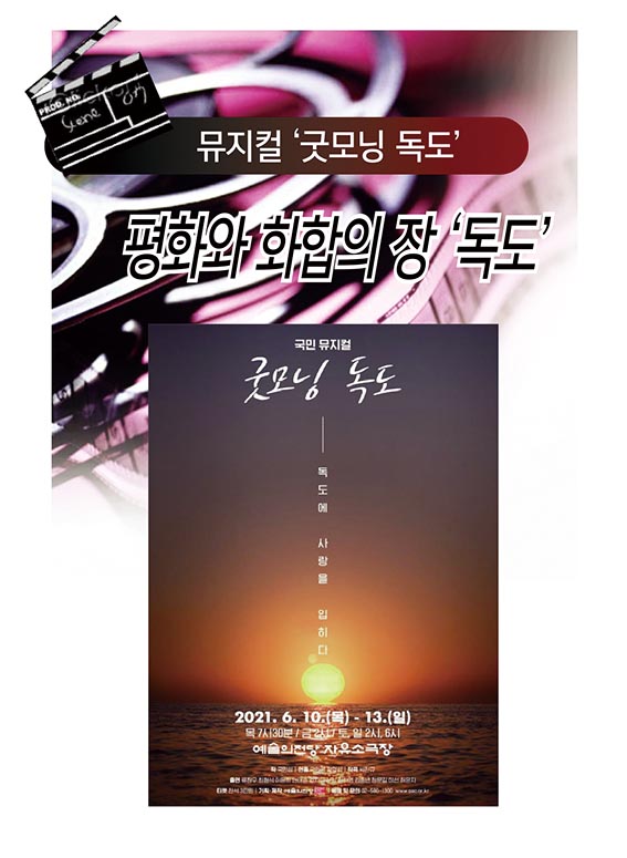 [일요서울 | 김정아 기자] 독도를 소재로 한 뮤지컬 ‘굿모닝 독도’가 오는 6월10일부터 13일에 예술의 전당 자유 소극장 무대에 오른다. 무대는 지난해 예술의 전당에서 공연된 THE 뮤지컬 ‘굿모닝 독도’ 업그레이드 버전이다. 이를 위해 주최 측인 예술의 전당에서는 공개 오디션을 통해 배우를 섭외하고 무대장치와 영상 디자인을 보완했다.