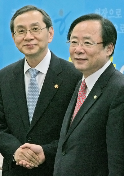 26일 국회에서 열린 공정거래위원회 당정협의에서 한나라당 이주영 정책위의장과 김동수 공정거래위원장이 악수를 하고 있다. 정대웅 기자