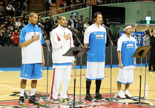 지난 1월 29일 오후 서울 잠실 실내체육관에서 열린 2010-2011 현대모비스 프로농구 올스타전 1년차팀과 2년차팀의 경기에 앞서 귀화선수인 문태영, 이승준, 전태풍이 애국가를 부르고 있다.