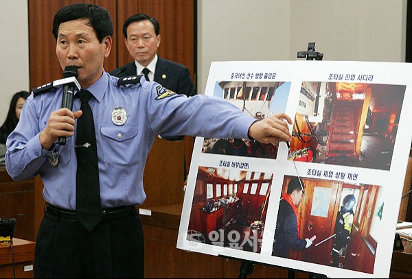 13일 국회 국토해양위원회에서 중국 어선의 폭력적인 불법 조업을 단속하던 해경 대원이 숨진 사건과 관련해 긴급 현안보고가 열린 가운데 김영암 함장이 사고 당시 상황설명을 하고 있다. <정대웅 기자> photo@ilyoseoul.co.kr 정대웅 기자 photo@ilyoseoul.co.kr 저작권자 © 일요서울i 무단전재 및 재배포 금지 정대웅 기자 다른기사 보기