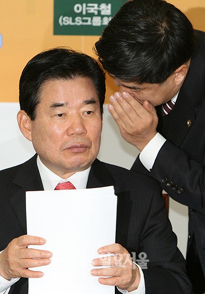10일 국회에서 열린 민주통합당 원내대책회의에서 김진표 원내대표와 백원우 의원이 귀엣말을 나누고 있다.