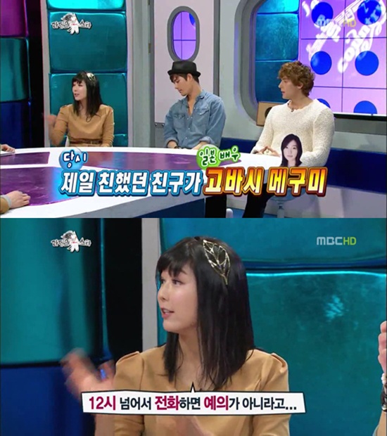 8일 방송된 MBC <황금어장-라디오스타>에 출연한 사유리는 “유일한 친구가 고바시 메구미다. 하지만 1년 전에 그 친구와 절교했다.”고 말했다.