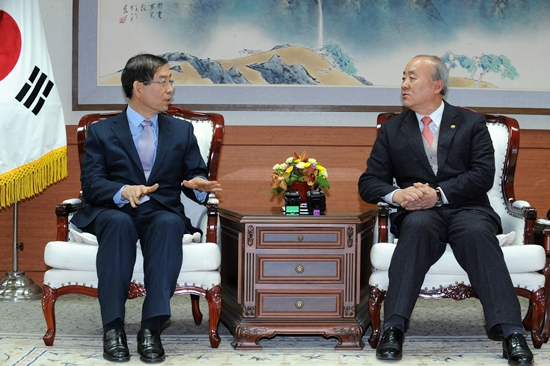 ▲ 박원순 시장은 15일 류유익 통일부 장관을 만나 경평축구·시향 교류 등에 관해 통일부의 협력을 구했다.