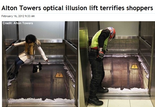 영국 테마파크 앨턴타워에는 겁주는 엘리베이터가 있다. 엘리베이터를 타는 순간 수십층 아래로 떨어질 수밖에 없는 착시현상을 불러일으킨다.