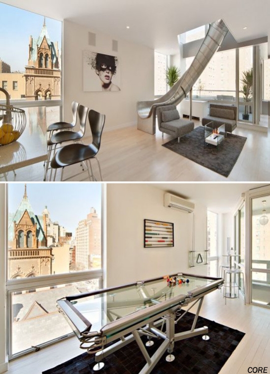 상층은 사무공간, 하층은 주거공간으로 분리돼 있는 이 펜트하우스는 5.5m 높이의 중앙 계단을 통해 연결된다. 눈에 띄는 건 이 중앙 계단이 미끄럼틀이라는 것. 여기에 시내 전경을 한눈에 내려다 볼수 있는 전면 유리창은 덤이다.