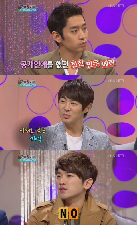 신화 에릭 이민우 전진은 데뷔 후 공개연해를 한 것과 관련 전진은 "결혼을 하면 모르지만 그게 아니면 후회도 있다"고 솔직하게 답했다. 제일 처음 공개연애를 했던 에릭 역시 이민우의 공개연애 고민에 "하지 말라"고 단호히 말했던 경험을 전했다.