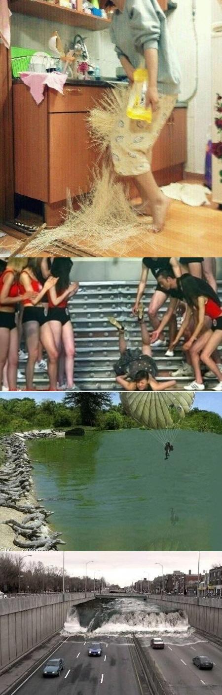 공개된 사진 속에는 한 여성이 국수요리를 하려다가 국수를 바닥에 다 쏟아버리는가 하면 시상식으로 보이는 곳에서 여성이 계단을 내려오다 넘어져 버린다.