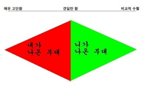 공개된 그림에는 매우 고단함, 견딜만함, 비교적 수월 이라는 세 부분으로 분류돼 있다. 이를 나누는 기준은 매우 간단하다. 한 가운데 선을 중심으로 왼쪽의 매우 고단함은 내가 나온 부대, 오른쪽 부분의 비교적 수월한 부대는 네가 나온 부대인 것.