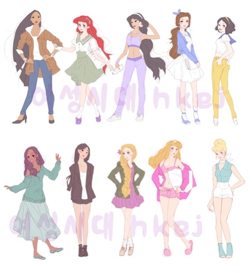 현대판 디즈니 공주 그림에는 포카혼타스, 인어공구, 자스민, 벨, 백설공주, 티아나, 뮬란, 라푼젤, 잠자는 숲속의 미녀, 신데렐라가 현대식으로 세련된 옷을 입고 있다.