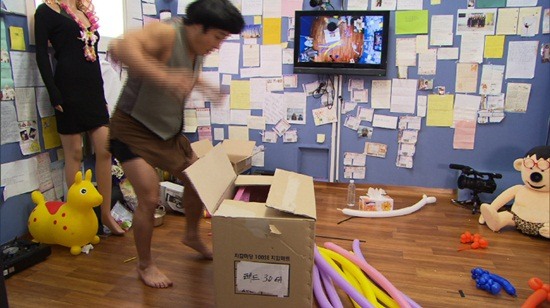 택배를 본 김병만은 순간 놀라서 넘어졌고, 눈치가 빠른 이수근은 동물적 감각으로 위험을 감지, 두 방 사이 개구멍을 단단히 고정하며 김병만을 나 몰라라 해 웃음을 자아냈다.