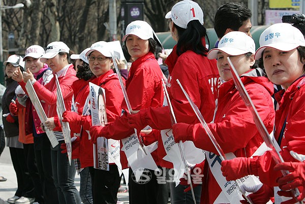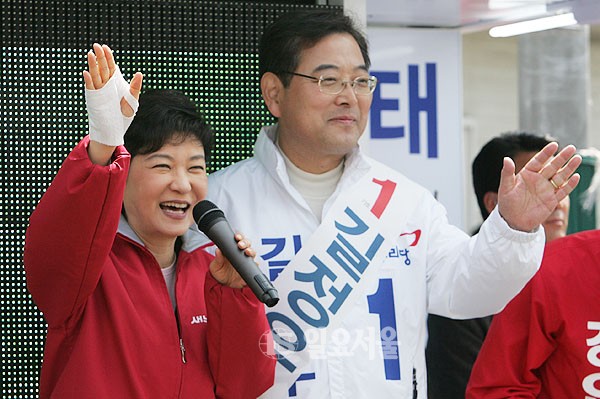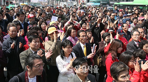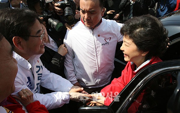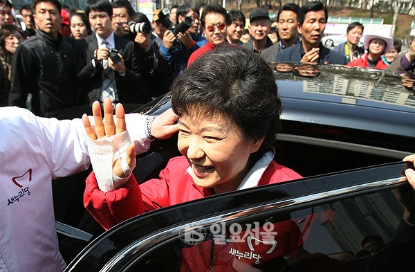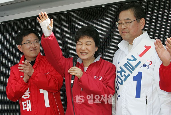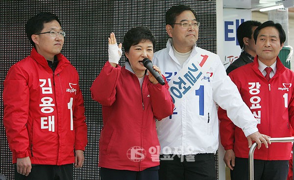 [일요서울 | 정대웅 기자]  새누리당 박근혜 위원장이 9일 서울 목동역 인근에서 길정우 양천구갑, 김용태 양천구을 후보의 지원유세를 하고 있다.